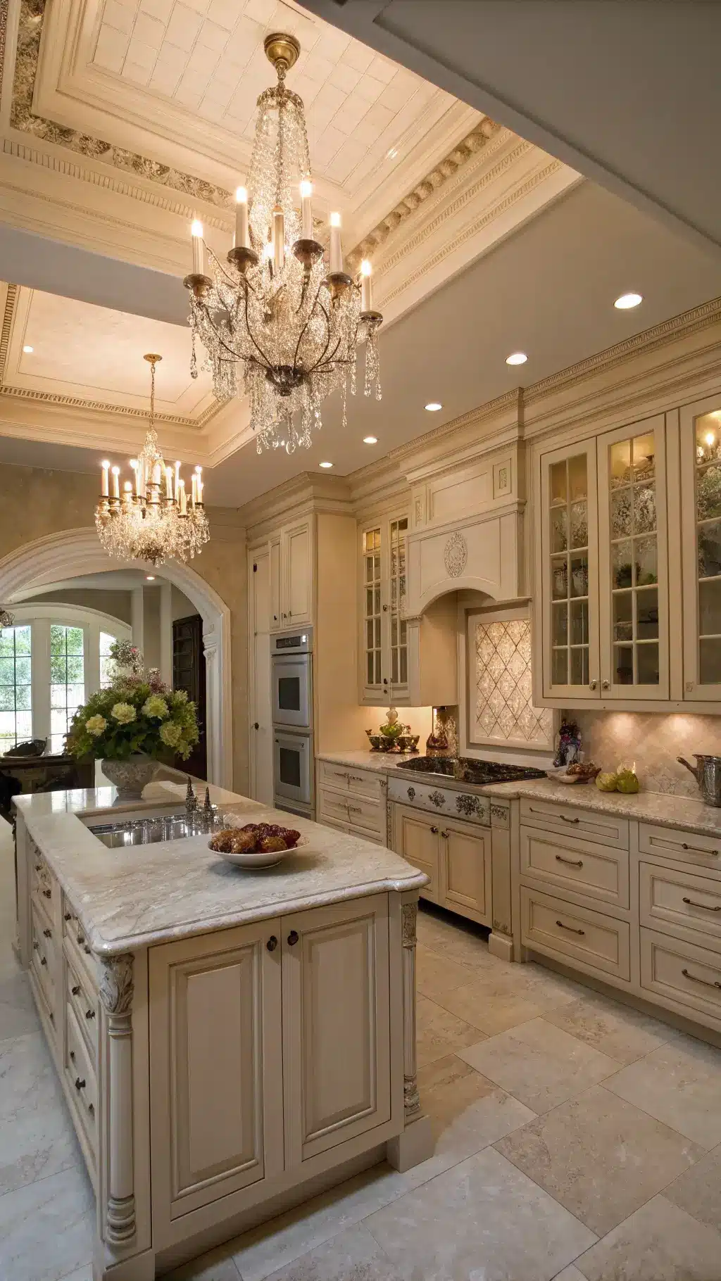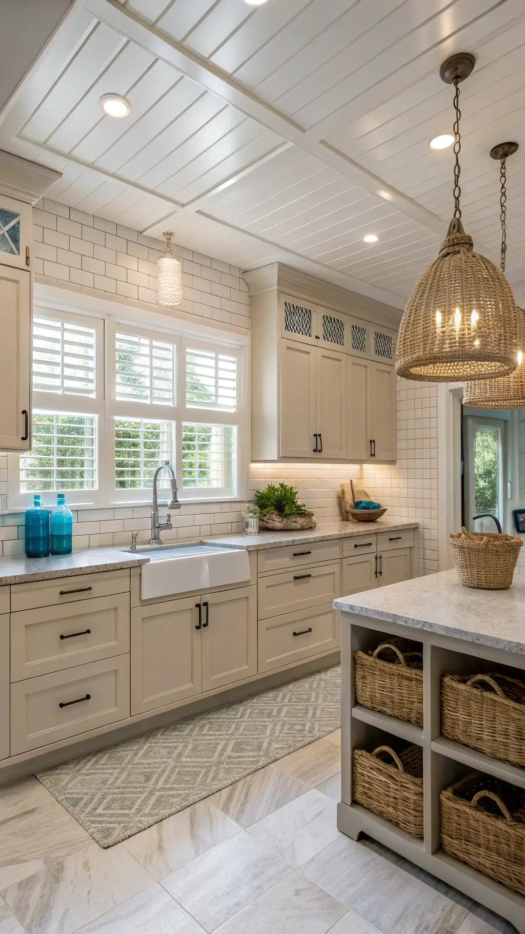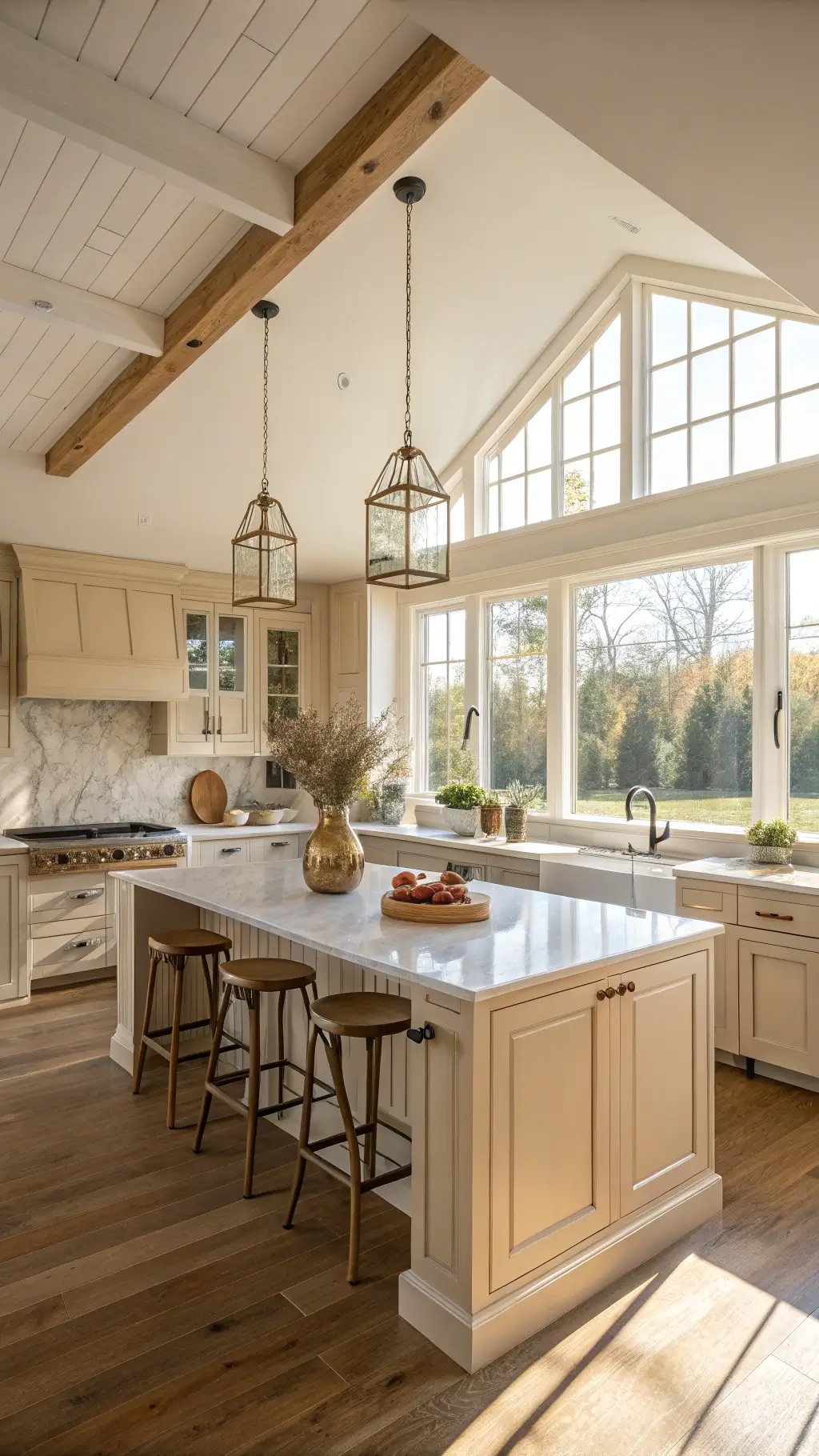 - Play with Contrast: Dark island + beige cabinets = chef’s kiss