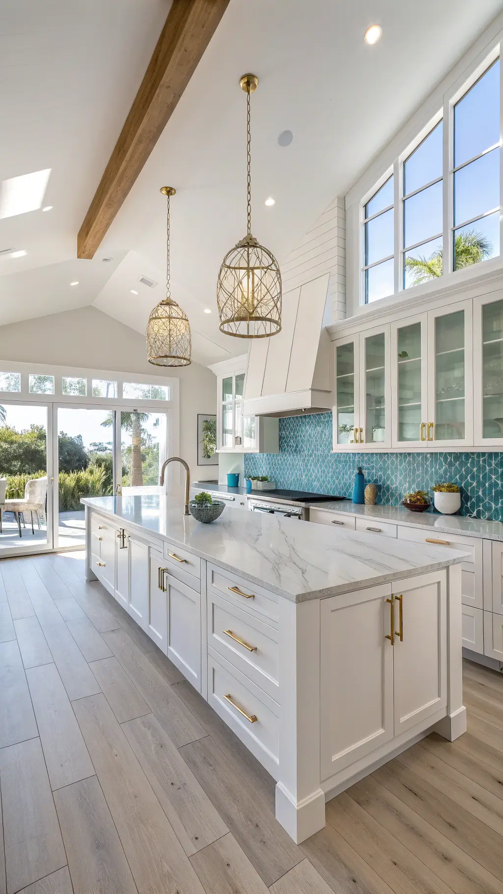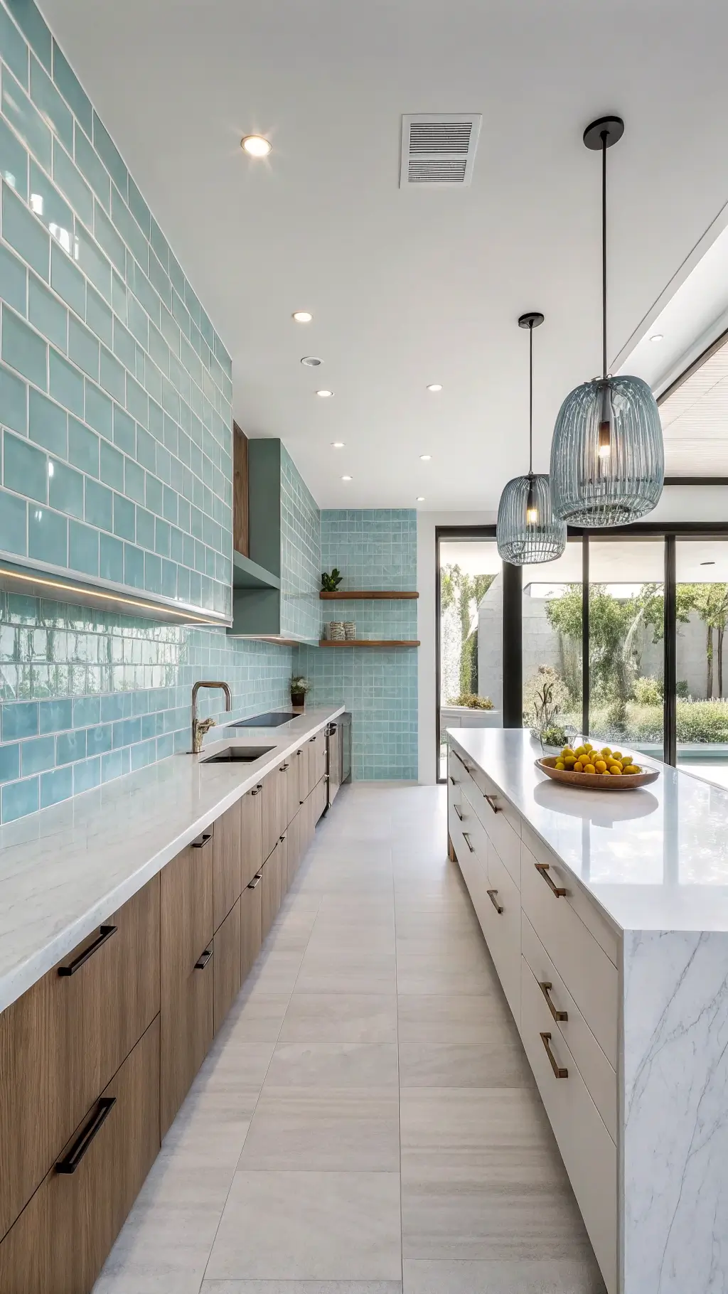 "Luxurious coastal kitchen with stunning blue glass subway tile backsplash, Carrara marble island, white shaker cabinets with brass hardware, and natural oak flooring"