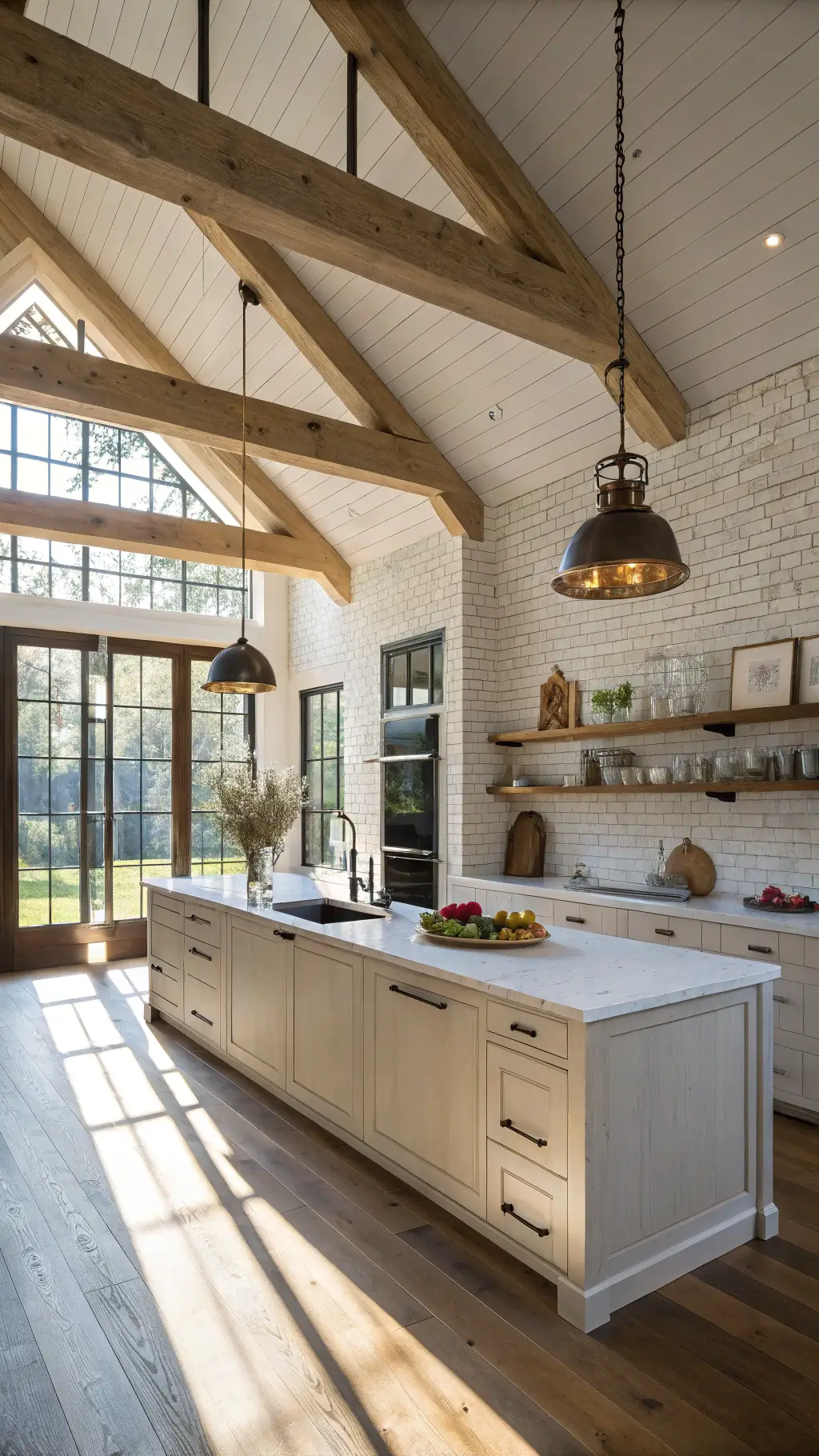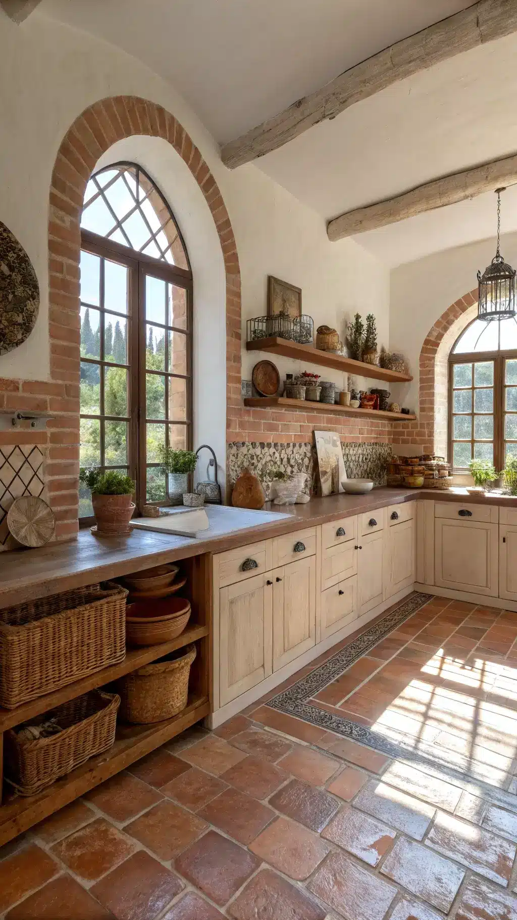 "Modern farmhouse kitchen with rustic brick backsplash, exposed wooden beams, vintage ceramic jars and fresh potted herbs on a marble island, in soft morning light."