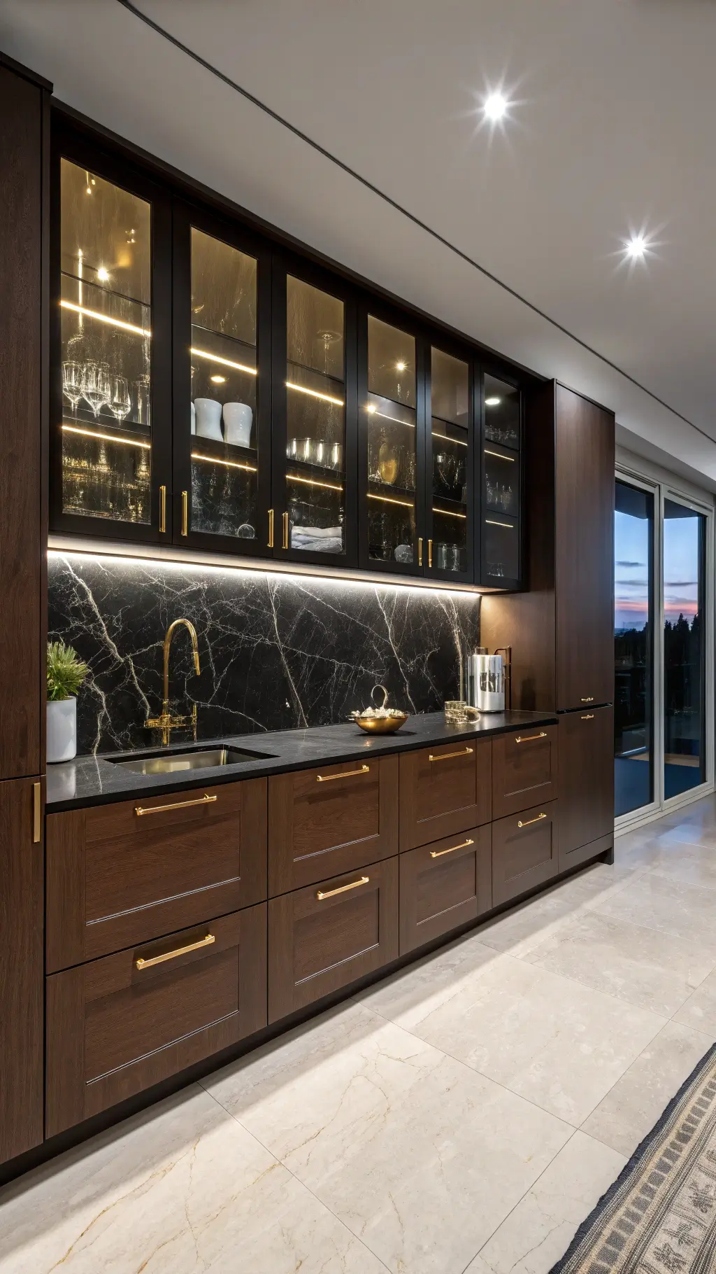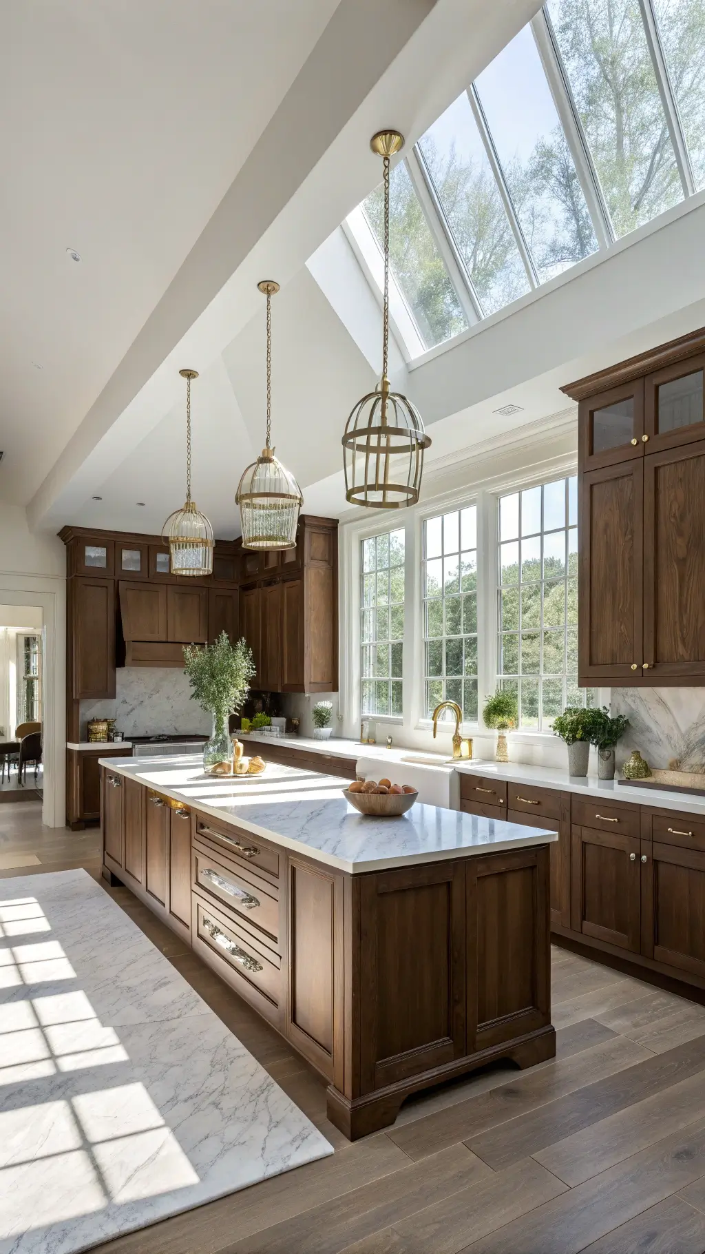 "Luxury kitchen with walnut brown cabinets, Calacatta marble countertops, brass accents, and copper cookware under Edison bulb pendants."