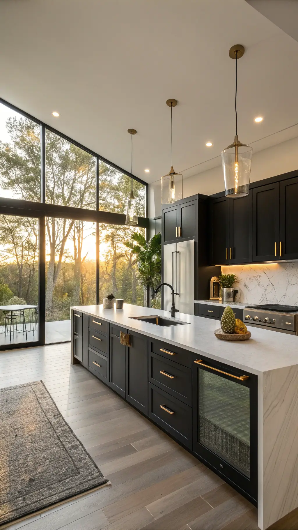 Keywords: dark kitchen cabinets, modern kitchen design, luxe kitchen styling, bold interior trends