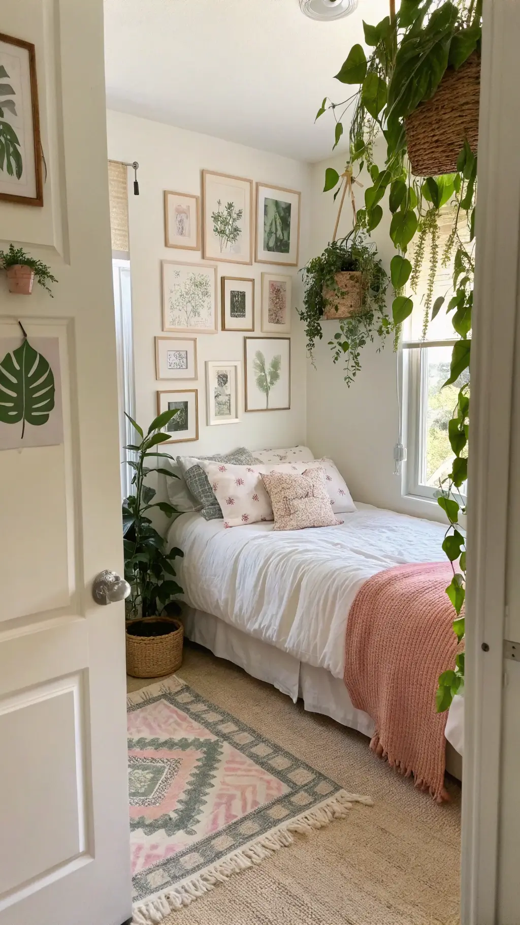 "Bohemian style dorm room bathed in golden hour light with mandala tapestry, fairy lights, layered textiles on bed, succulent plants on desk, and gallery wall of black-framed prints."