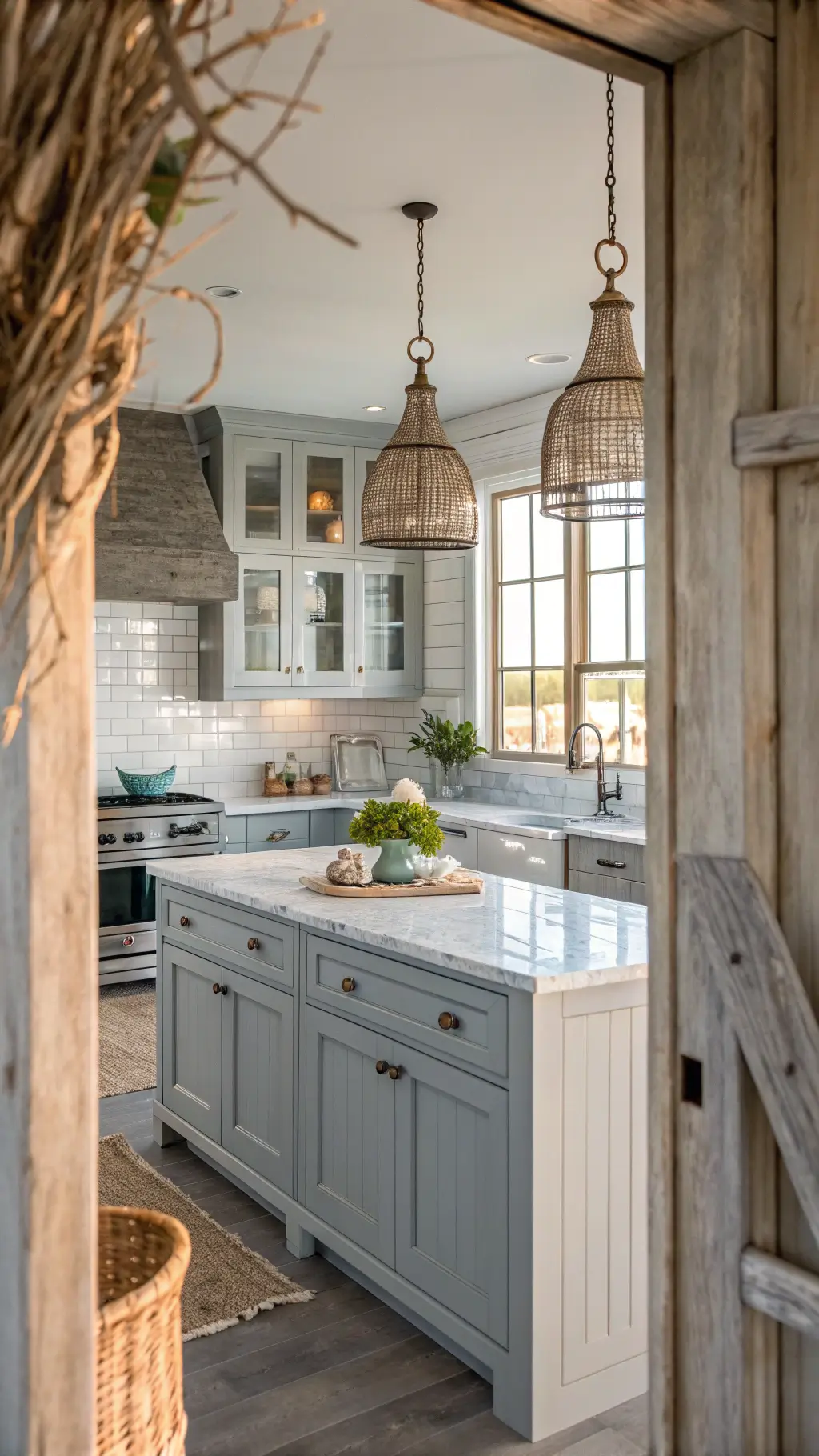 - Coastal Gray: Incorporate aqua glass and driftwood accents