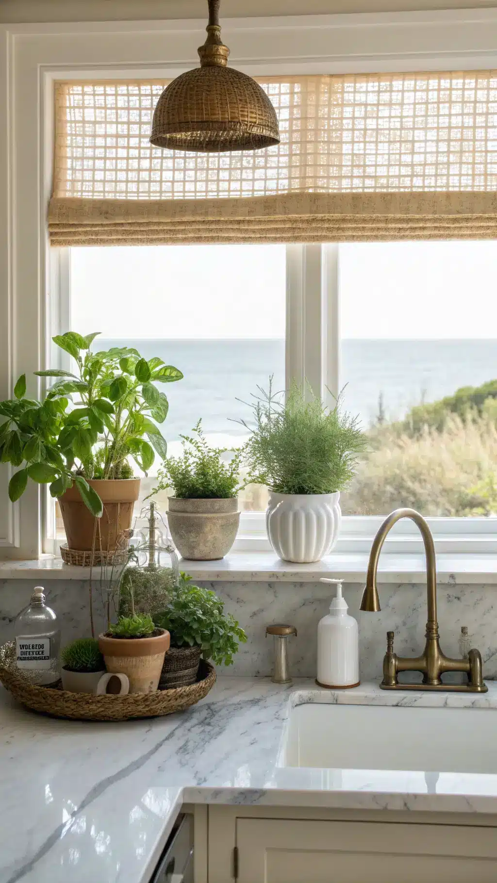 - Combine wood, marble, and woven elements