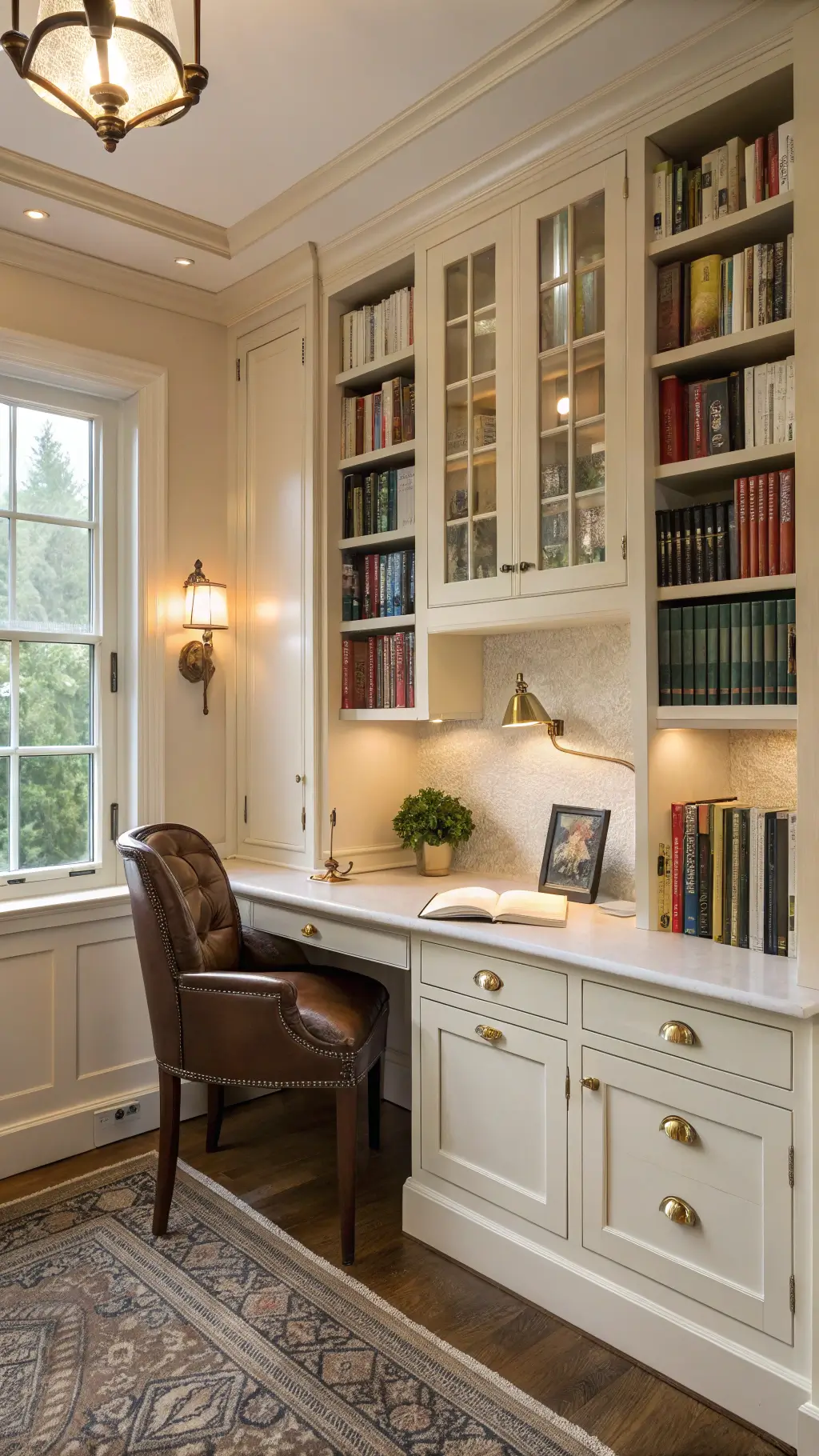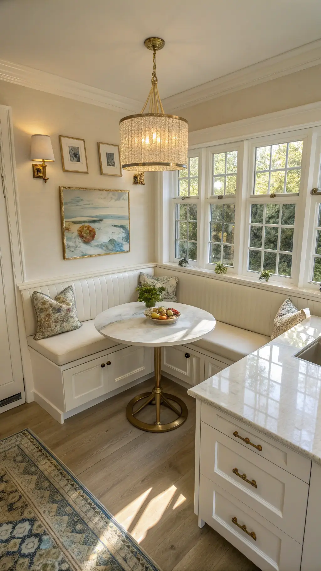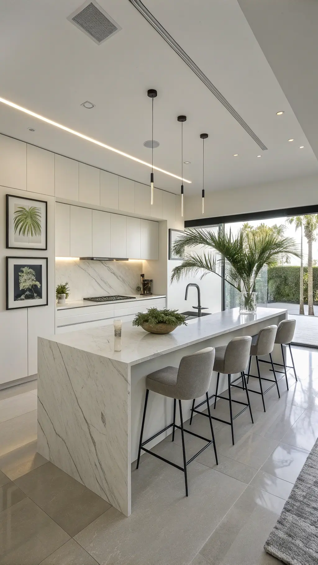 "Luxurious off-white kitchen with marble island, brass hardware, and warm neutral tones"