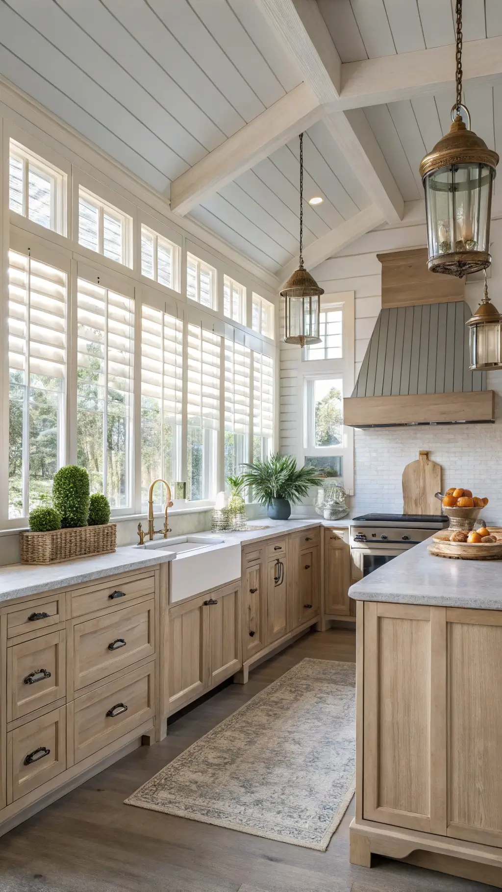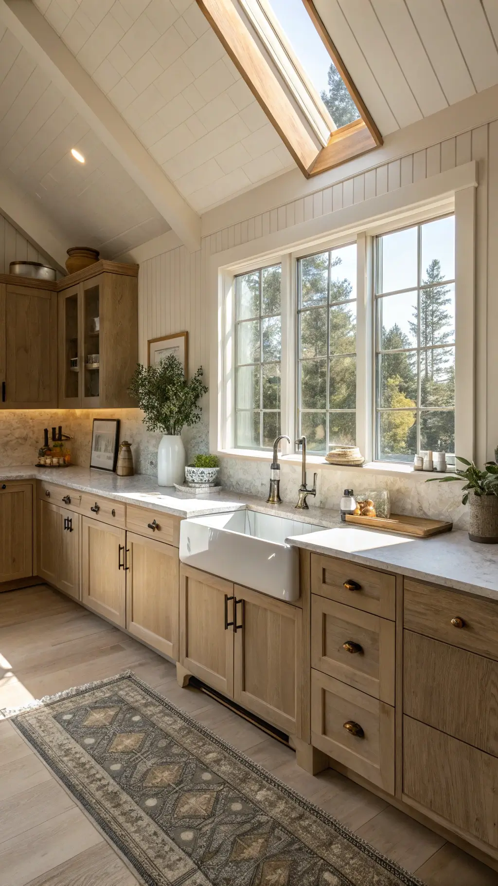 "Pale Oak kitchen cabinets with brass hardware, quartzite countertops under soft morning light"
