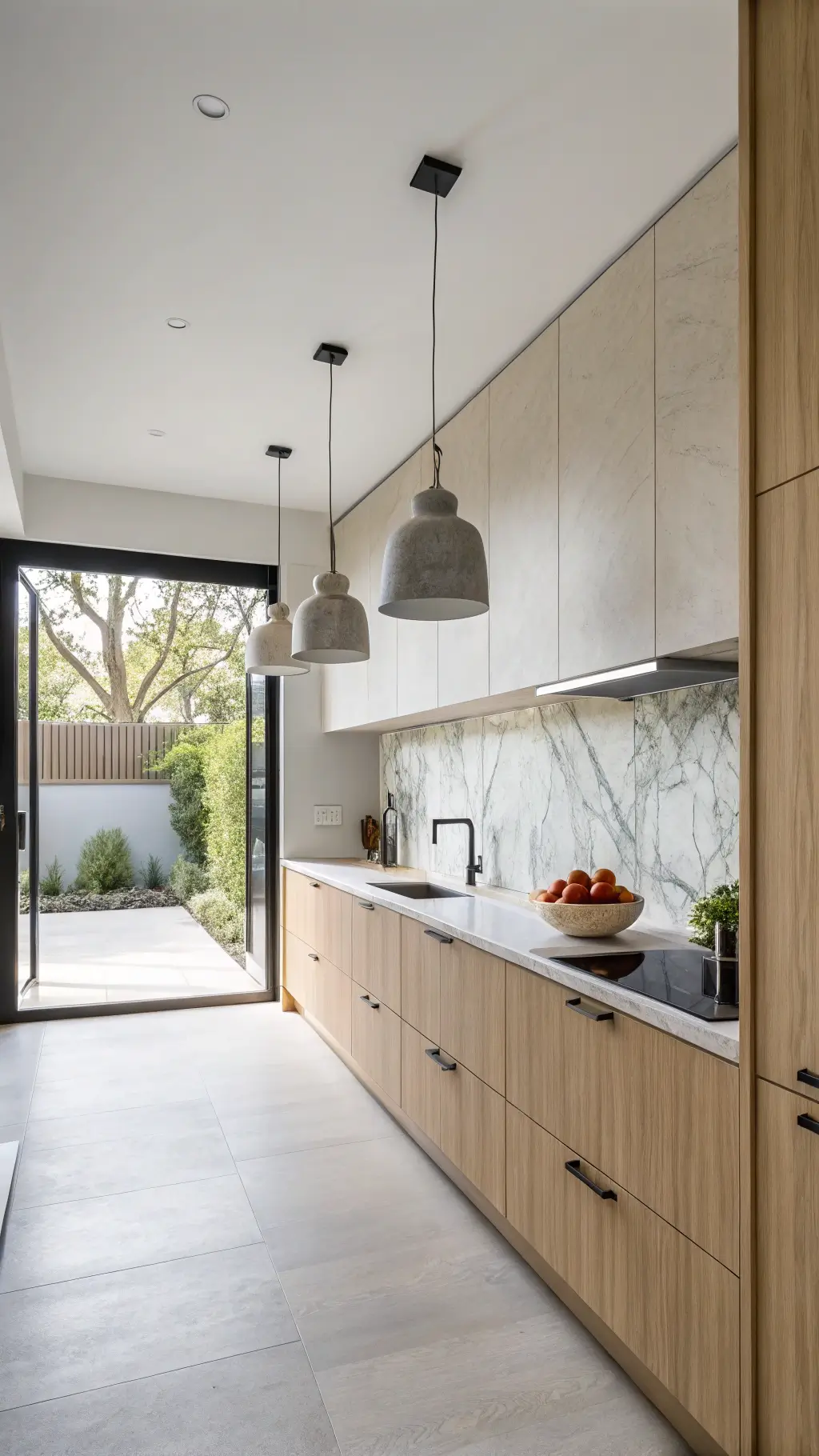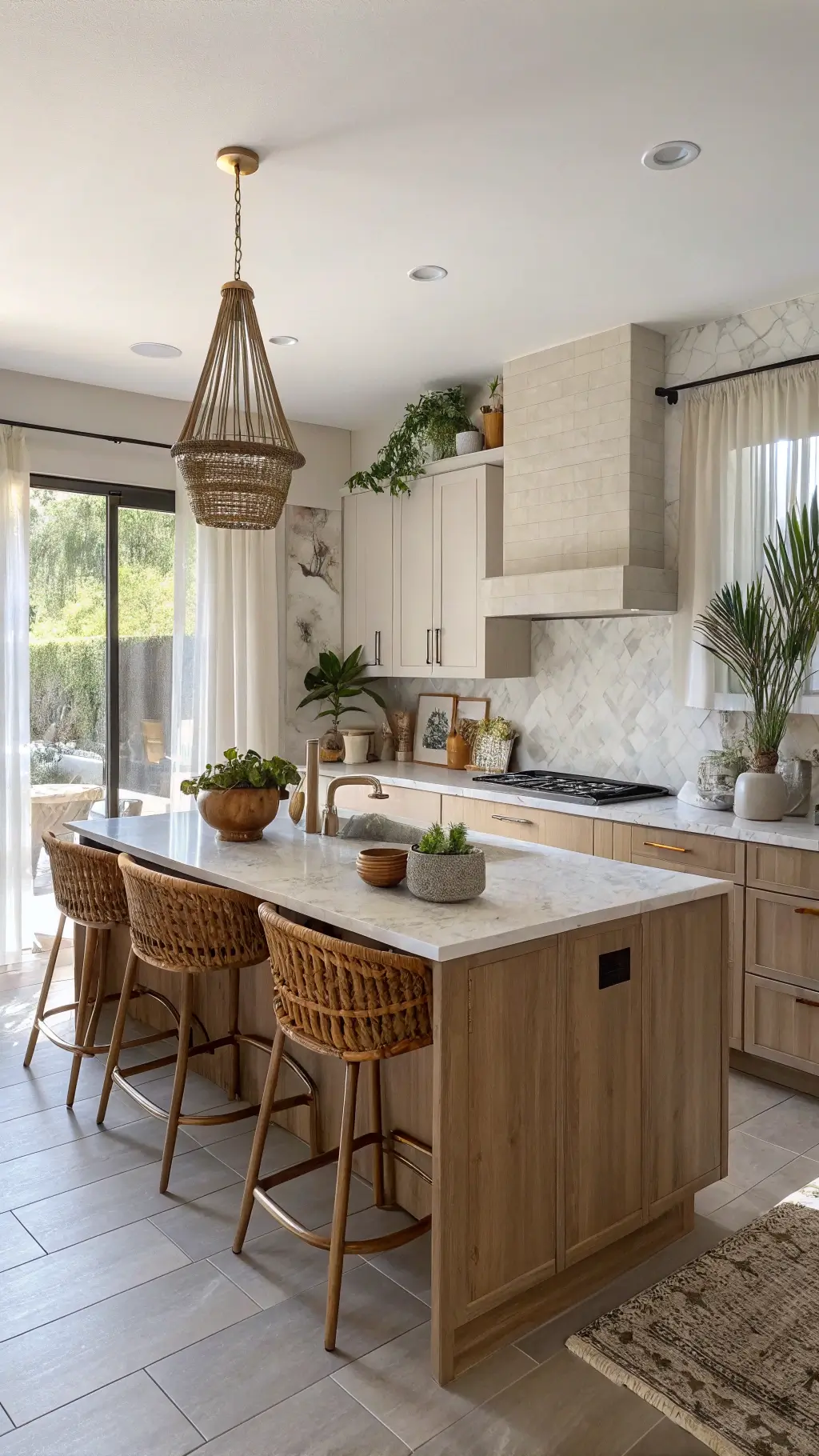 Spacious, light-filled open-concept kitchen with pale Oak cabinets, marble-veined backsplash, an island with casual seating, and touches of brass and fresh citrus accents.