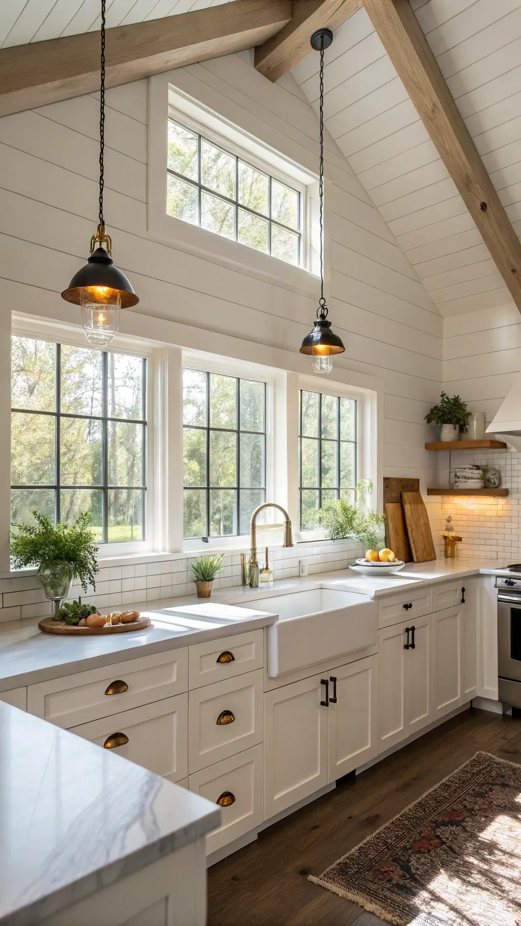"Sunlit modern farmhouse kitchen with white shiplap backsplash, brass hardware, marble countertops and distressed wood accessories"