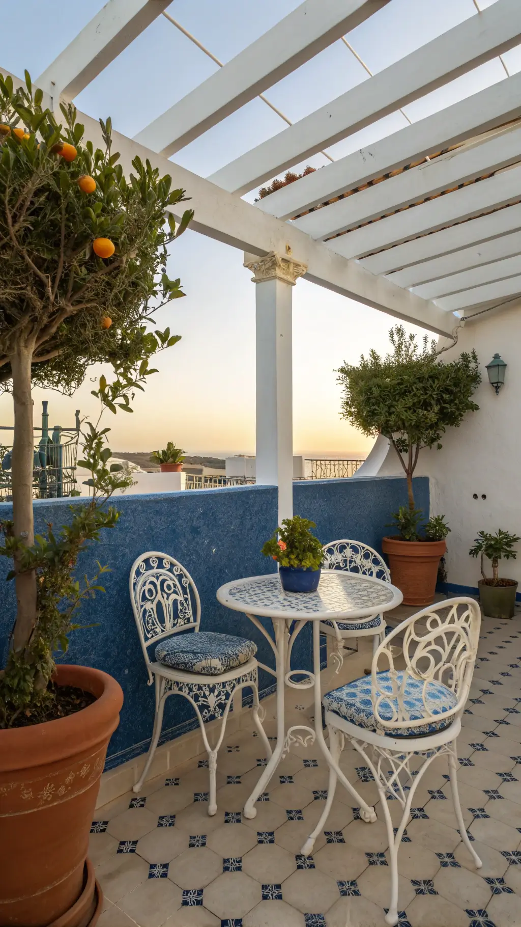 "Cozy urban balcony with bistro furniture, string lights, potted plants and cityscape view during golden hour"