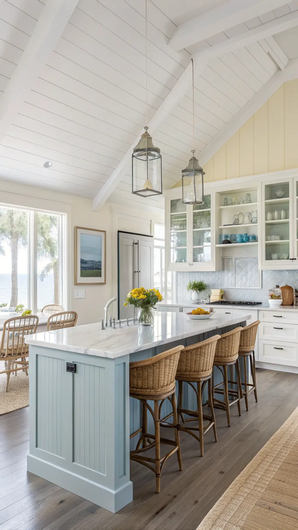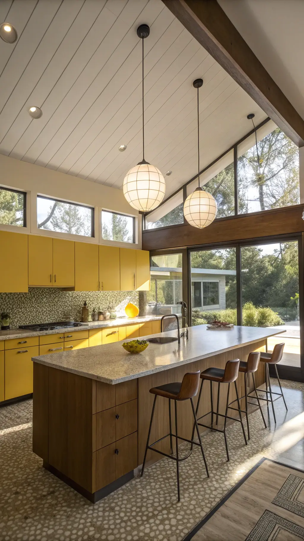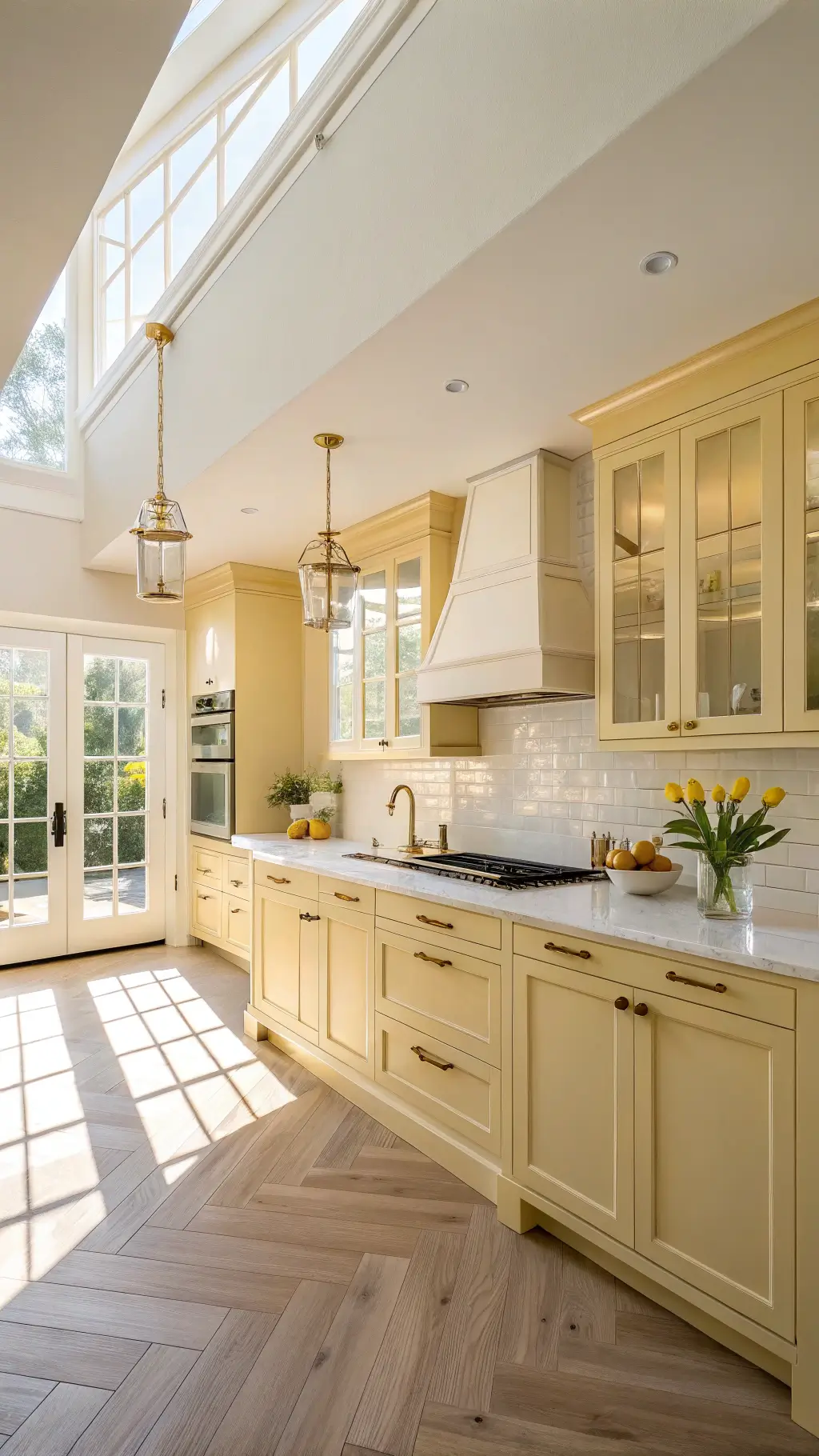 - Use yellow strategically—maybe just the island or lower cabinets